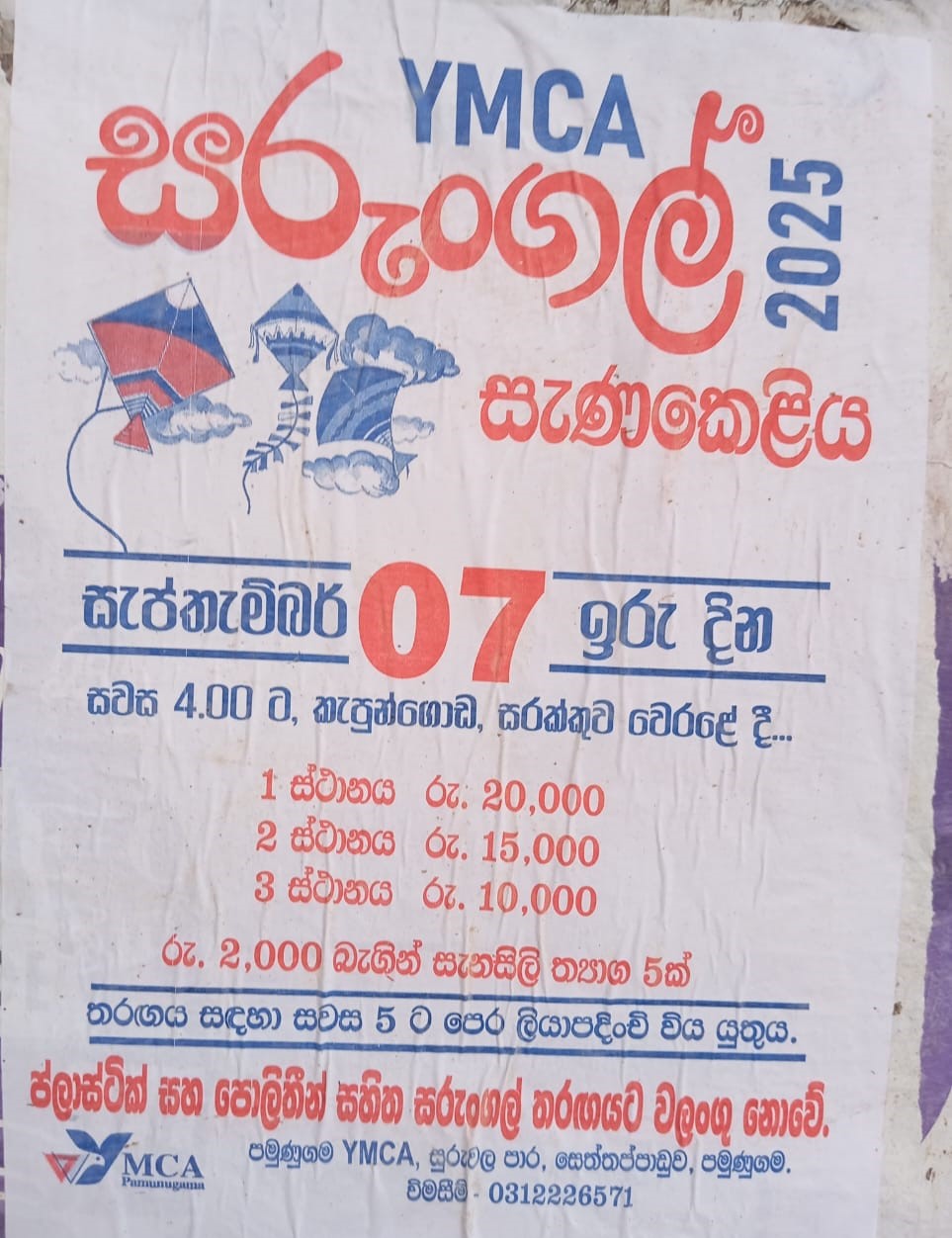 YMCA 2025 සරුංගල් සැණකෙළියේ පළමු ස්ථානයට රුපියල් 20,000.00 ක් ද, දෙවන ස්ථානයට රුපියල් 15,000.00 ක් ද, තෙවන ස්ථානයට රුපියල් 10,000.00 ක් ද, රුපියල් 2,000.00 බැගින් තවත් සැනසිළි ත්යාග 05ක් ද පිරිනමන බව සංවිධායකයෝ කීහ.