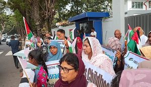 ගිවිසගත් සටන් විරාමය නොසළකා හරිමින් පලස්තීනය තුළ නැවතත් සිදුවෙමින් පවතින අමානූෂීක ක්රියාපිළිවෙත හෙලාදකින, ශ්රී ලංකාවේ “නිදහස් පලස්තීන ව්යාපාරයේ” නියෝජිතයින් පිරිසක් සහ ඇතැම් සිවිල් සංවිධාන සහ මානව හිමිකම් ක්රියාකාරීන් පිරිසක් ඔක්තෝබර් 21 වන අඟහරුවාදා සවස පලස්තීන තානාපති කාර්යාලයේ සිට කොළඹ එක්සත් ජාතීන්ගේ කාර්යාලය දක්වා පා ගමනකින් පැමිණි පසුව විරෝධතාවක් පැවැත්වූහ. “ස්ථිර සටන් විරාමයක් සඳහා සහ දේශපාලන සිරකරුවන් නිදහස් කිරීම සඳහා මැදිහත් වන ලෙස” බල කරමින් එක්සත් ජාතීන්ගේ සංවිධානයට පෙත්සමක් භාරදුන් බව ද සංවිධායකයෝ පැවසූහ.