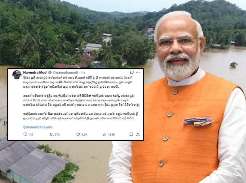ඉන්දියාවේ අසල්වැසියා ප්රථමයෙන් යන ප්රතිපත්තිය සහ මහාසාගර් දැක්ම අනුව ඉන්දියාව ශ්රී ලංකාවට උදව් අවශ්ය වන මෙම මොහොතේ තවදුරටත් ශ්රී ලංකාව සමඟ ශක්තිමත්ව රැඳී සිටින බව සිය නිල X ගිණුමේ සටහනක් තබමින් ඉන්දීය අග්රාමාත්ය නරේන්ද්ර මෝදි මහතා පවසයි.